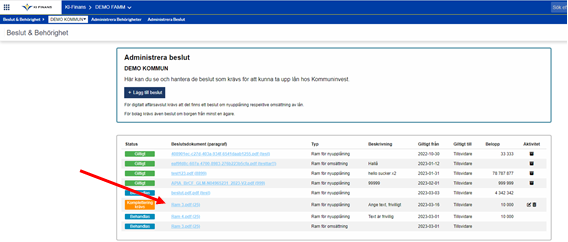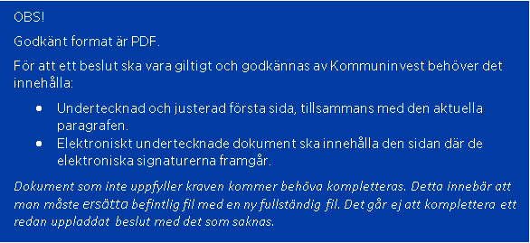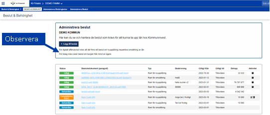 Det är viktigt att ni laddar upp beslut som ligger till grund för det kommande lånet. Beslutet kommer att få status Giltigt när det har kontrollerats och godkänts av Kommuninvest.