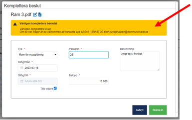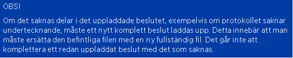 Beslutet behöver kompletteras. Ni har möjlighet att redigera beslutet samt ersätta befintlig fil.