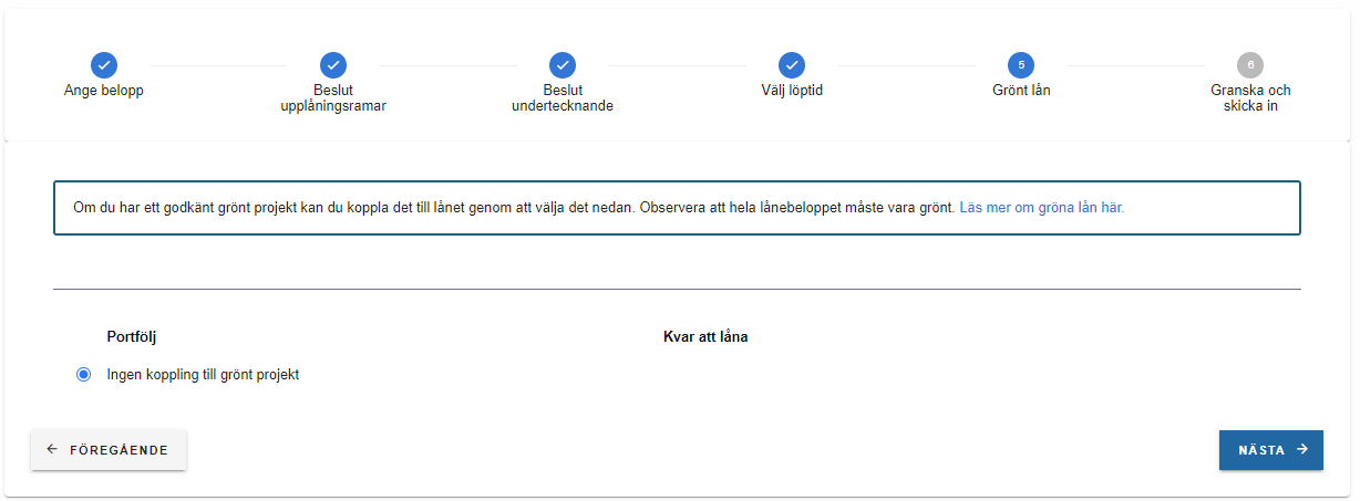 7. Finns godkända gröna projekt kommer dessa att listas och möjlighet att välja att koppla lånet till ett grönt projekt. Annars välj Ingen koppling till grönt projekt gå sedan vidare till "Nästa"