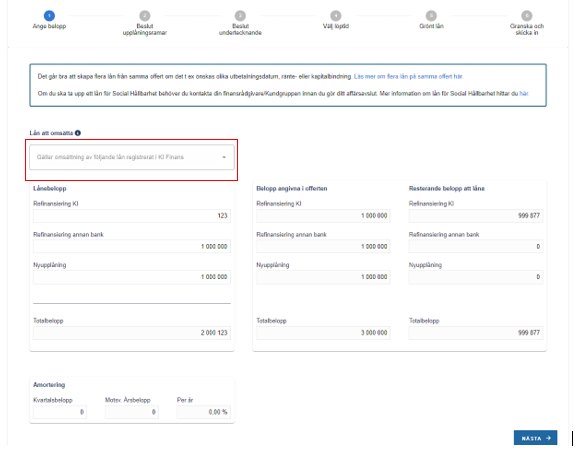 5. Ange lånebelopp och eventuell amortering, amorteringsfrekvens anges i nästa steg. Vid refinansiering av lån hos KI, välj vilket/vilka lån som ska omsättas i rullistan. Gå vidare till "Välj löptid".